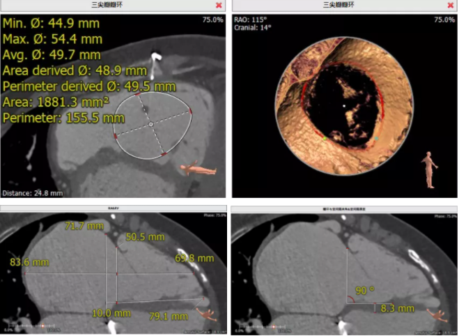 患者為68歲女性,14年前因“反復(fù)感冒、氣促”,檢查發(fā)現(xiàn)心臟瓣膜病,接受了“二尖瓣機械瓣置換術(shù)”。約5年前出現(xiàn)雙下肢水腫,活動后心累氣緊,心臟彩超提示:三尖瓣返流。近年來三尖瓣返流逐漸加重并伴有輕微黃疸、雙下肢水腫,雖長期服用利尿劑治療,但效果欠佳。郭惠明教授團隊結(jié)合病史、超聲及CT評估,考慮患者瓣膜置換術(shù)后,三尖瓣重度返流,再次開胸行體外循環(huán)手術(shù)風險高,經(jīng)團隊整體評估,決定采用最適合患者的LuX-Valve三尖瓣置換系統(tǒng)行微創(chuàng)治療,根據(jù)測量結(jié)果選擇植入JS/TTVI-28-55型號的LuX-Valve瓣膜。