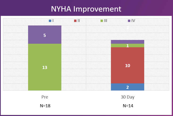 圍術(shù)期無(wú)院內(nèi)死亡事件發(fā)生,腦血管事件、心梗和再次手術(shù)干預(yù)發(fā)生率均為0%。僅一例患者在術(shù)后10天因房顫植入永久起搏器,其他患者均無(wú)并發(fā)癥發(fā)生。術(shù)后30天隨訪(fǎng)結(jié)果顯示,患者TR嚴(yán)重程度和NYHA心功能分級(jí)顯著改善(圖1、圖2)。全因死亡率為5.6%(與器械無(wú)關(guān)),心血管死亡、腦血管事件、心梗和再次手術(shù)干預(yù)發(fā)生率均為0%。手術(shù)成功率為100%,無(wú)患者轉(zhuǎn)外科開(kāi)胸。在會(huì)議期間,Anson Cheung教授還展示了一個(gè)簡(jiǎn)短的手術(shù)視頻(見(jiàn)手術(shù)短視頻),分布拆解了LuX-Valve Plus經(jīng)血管(頸靜脈)三尖瓣置換的手術(shù)要點(diǎn),并強(qiáng)調(diào)了LuX-Valve Plus給術(shù)者帶來(lái)的手術(shù)體驗(yàn)感好、容錯(cuò)率高,得到了現(xiàn)場(chǎng)醫(yī)生同道的一致好評(píng)。