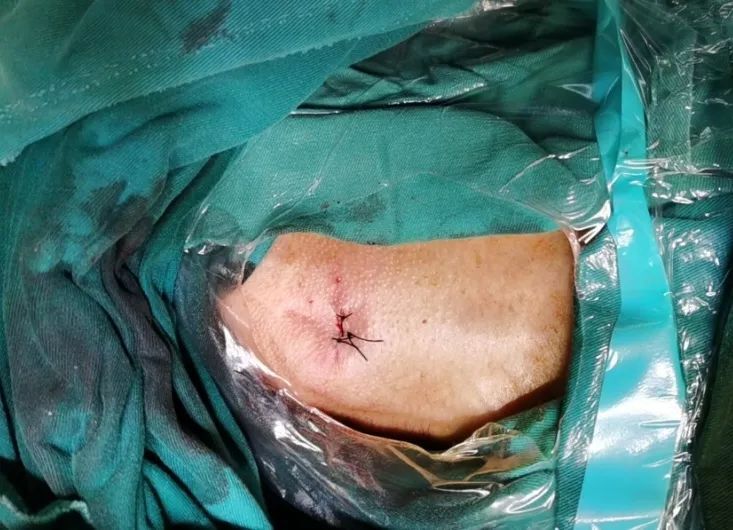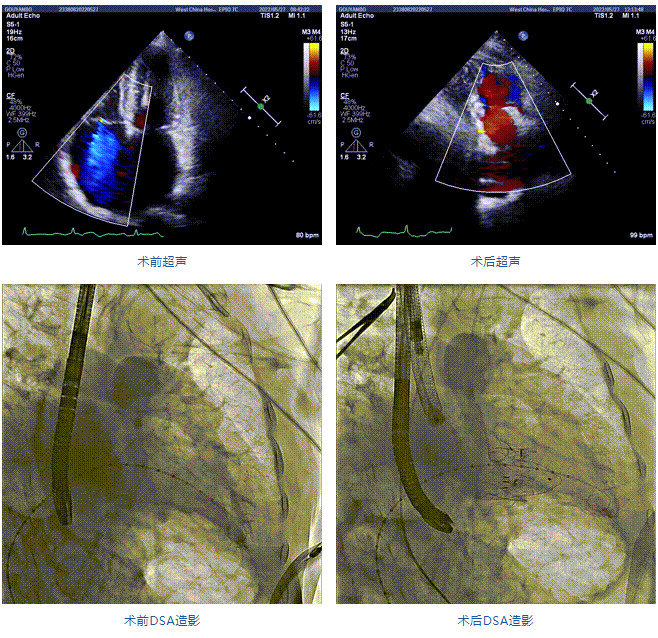團(tuán)隊(duì)前期經(jīng)過多次討論,制定了周密的手術(shù)策略和預(yù)案。由于患者已是近九旬的超高齡老人,傳統(tǒng)外科開胸手術(shù)風(fēng)險(xiǎn)極高,純介入經(jīng)血管三尖瓣替換能夠明顯減少創(chuàng)傷。術(shù)中陳茂及馮沅教授結(jié)合體表定位在造影指示下精準(zhǔn)穿刺右側(cè)頸靜脈并預(yù)置兩把血管縫合器。成功建立經(jīng)皮血管入路后在食道超聲和DSA的引導(dǎo)下順利完成人工瓣膜植入,術(shù)后超聲和造影顯示人工三尖瓣同軸性良好,瓣架固定牢靠,無反流和瓣周漏,平均跨瓣壓差降為1mmHg。術(shù)畢收緊預(yù)置的血管縫合器縫線完成止血,縫合效果滿意,在手術(shù)室即刻拔除氣管插管。