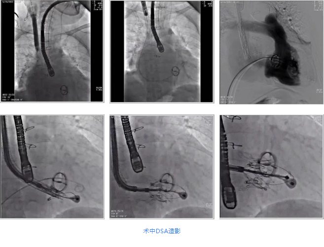 根據(jù)術(shù)前評(píng)估結(jié)果,郭應(yīng)強(qiáng)教授團(tuán)隊(duì)為患者量身定制了手術(shù)策略,決定使用LuX-Valve Plus經(jīng)血管三尖瓣置換系統(tǒng)開(kāi)展手術(shù)治療。手術(shù)在全麻下進(jìn)行,采用經(jīng)右側(cè)頸靜脈入路,在經(jīng)食道超聲和DSA的指引下調(diào)整輸送器角度以達(dá)到正確位置,勾住前瓣后逐步釋放盤(pán)片,盤(pán)片打開(kāi)后順利扎針,最終完成瓣膜植入,輸送器撤出。術(shù)后超聲提示人工三尖瓣同軸性良好,瓣架固定牢靠,無(wú)反流和瓣周漏,術(shù)后三尖瓣平均跨瓣壓差為1 mmHg。