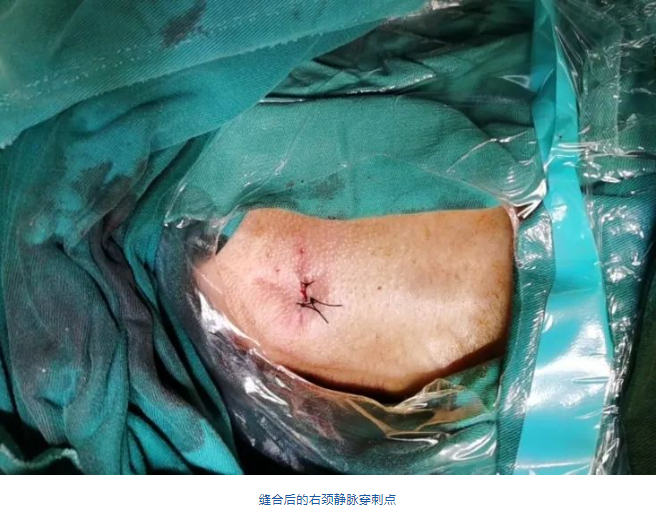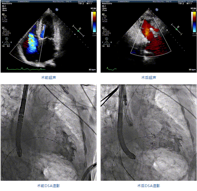 團(tuán)隊(duì)前期經(jīng)過(guò)多次討論,制定了周密的手術(shù)策略和預(yù)案。由于患者已是近九旬的超高齡老人,傳統(tǒng)外科開(kāi)胸手術(shù)風(fēng)險(xiǎn)極高,純介入經(jīng)血管三尖瓣替換能夠明顯減少創(chuàng)傷。術(shù)中陳茂及馮沅教授結(jié)合體表定位在造影指示下精準(zhǔn)穿刺右側(cè)頸靜脈并預(yù)置兩把血管縫合器。成功建立經(jīng)皮血管入路后在食道超聲和DSA的引導(dǎo)下順利完成人工瓣膜植入,術(shù)后超聲和造影顯示人工三尖瓣同軸性良好,瓣架固定牢靠,無(wú)反流和瓣周漏,平均跨瓣壓差降為1mmHg。術(shù)畢收緊預(yù)置的血管縫合器縫線完成止血,縫合效果滿意,在手術(shù)室即刻拔除氣管插管。