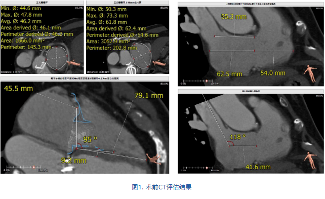 接受本次治療的是一例三尖瓣重度反流的患者,NYHA心功能Ⅲ級(jí)。主訴“反復(fù)活動(dòng)后氣促1年,下肢水腫4個(gè)月”。入院N末端B型腦鈉肽前體(NT-proBNP)3161pg/ml。心電圖提示:心房顫動(dòng),ST-T改變。術(shù)前超聲提示:重度三尖瓣關(guān)閉不全,右心房擴(kuò)大,三尖瓣收縮期位移(TAPSE)14mm,左房增大,左室收縮功能正常低值,主動(dòng)脈瓣、二尖瓣機(jī)械瓣功能良好。術(shù)前CT評(píng)估(圖1):三尖瓣瓣環(huán)(周長換算直徑)大小為46.2mm;入路血管無嚴(yán)重迂曲,無鈣化;雙側(cè)冠脈有鈣化。