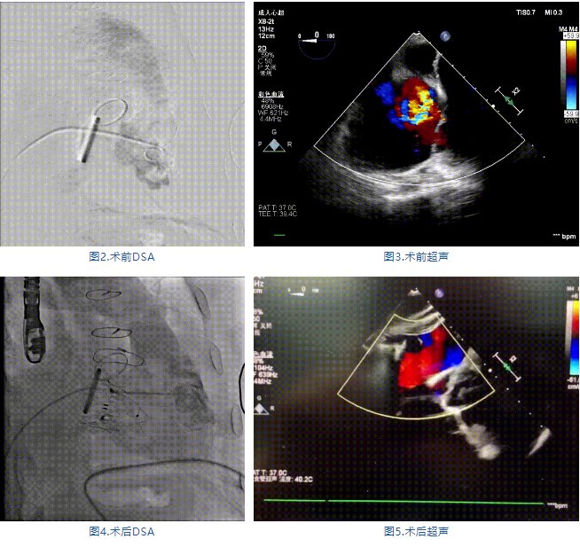 手術(shù)在全麻狀態(tài)下進(jìn)行,郭惠明教授團(tuán)隊(duì)采用經(jīng)右側(cè)頸靜脈入路的方式送入輸送器進(jìn)入體內(nèi),并在TEE和DSA的指引下進(jìn)行。在輸送器進(jìn)入右室后釋放室間隔錨定裝置,旋轉(zhuǎn)輸送器,使得錨定裝置對(duì)準(zhǔn)室間隔面;而后釋放前瓣夾持件,確定夾持件位于右室側(cè)釋放LuX-Valve Plus人工瓣膜盤片,再使用DSA和超聲確認(rèn)盤片是否位于右房側(cè),同時(shí)調(diào)整瓣膜的同軸性。緊接著在DSA和超聲的監(jiān)視下調(diào)整室間隔錨定件貼合室間隔,釋放室間隔錨定裝置。再次確認(rèn)瓣膜的穩(wěn)定性和同軸性后,將輸送器撤出體內(nèi),最終完成LuX-Valve Plus人工瓣膜植入(圖2-5),手術(shù)獲得圓滿成功?;颊咴谑中g(shù)室即刻拔除氣管插管,術(shù)后超聲提示LuX-Valve Plus人工三尖瓣瓣膜同軸性良好,瓣架固定牢靠,無反流和瓣周漏。