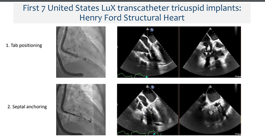 Dee Dee Wang教授隨后分享了Henry Ford Hospital前7例LuX-Valve Plus的植入經(jīng)驗,并提示術中確定瓣葉夾持鍵的位置處于三尖瓣瓣環(huán)下方(右心室側),以及室間隔固定片與室間隔的相對位置關系是最關鍵的兩個步驟。通過經(jīng)胃底短軸切面,配合右室流入/流出道切面的X-plane就能較容易地獲取相關影像。由于LuX-Valve Plus對超聲影像的要求較低,手術過程簡單易操作。
