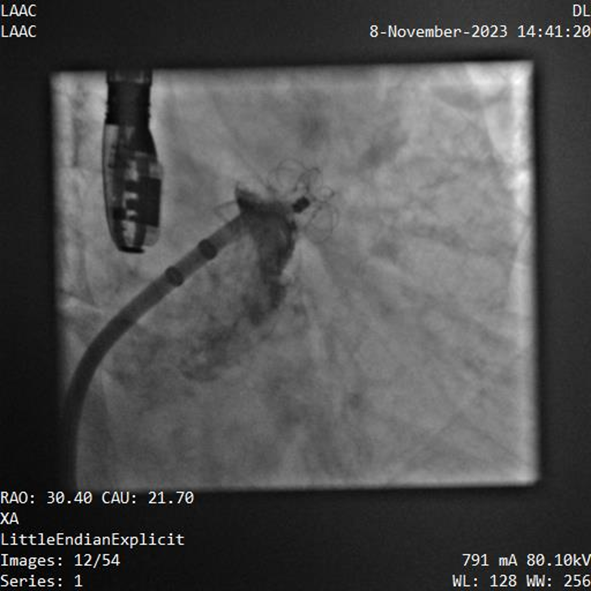 該例患者為男性58歲,陣發(fā)性房顫,9個月前突發(fā)急性腦梗死,3月前曾行房顫射頻消融術(shù)。2023年11月經(jīng)胸超聲心動圖示左房內(nèi)徑46mm,經(jīng)食道超聲心動圖示左心房及左心耳內(nèi)未見血栓形成,CHA2DS2-VASc評分3分,HAS-BLED評分2分。DSA測得左心耳開口直徑約23mm,錨定區(qū)域約18mm。