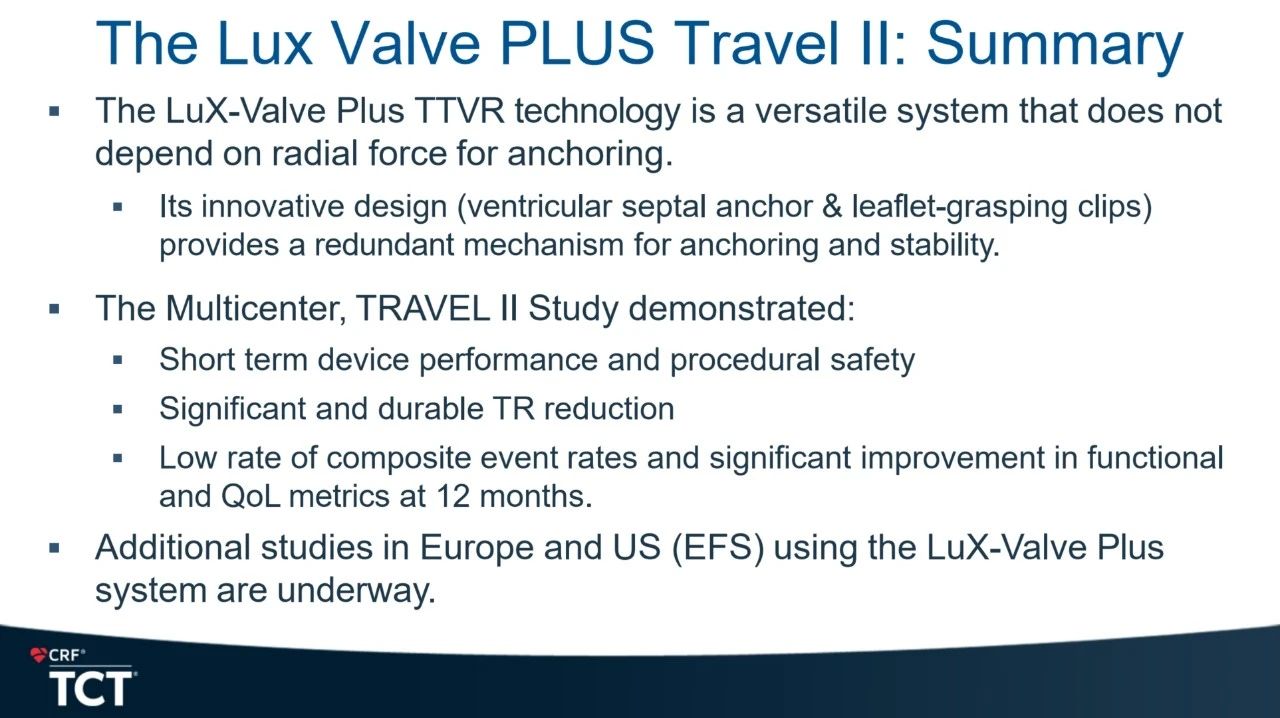 Granada教授表示,LuX-Valve Plus 是一款不依賴于徑向支撐力固定的多功能 TTVR 器械,它的創(chuàng)新設(shè)計(jì)(室間隔錨定和瓣葉夾持件)提供了多樣的固定和穩(wěn)定技術(shù)。多中心臨床試驗(yàn)研究 TRAVEL II 展現(xiàn)了 LuX-Valve Plus 的安全性和有效性,能實(shí)現(xiàn)較短的器械操作時(shí)間,較低的復(fù)合事件發(fā)生率。1年期的數(shù)據(jù)延續(xù)了6個(gè)月數(shù)據(jù)的優(yōu)異結(jié)果,顯示了其長久的可靠性,尤其是1年期時(shí)顯著降低三尖瓣返流等級,以及帶來心功能和生活質(zhì)量等指標(biāo)的明顯改善。